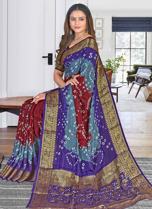 Bandhej Saree Art Silk Blue Maroon