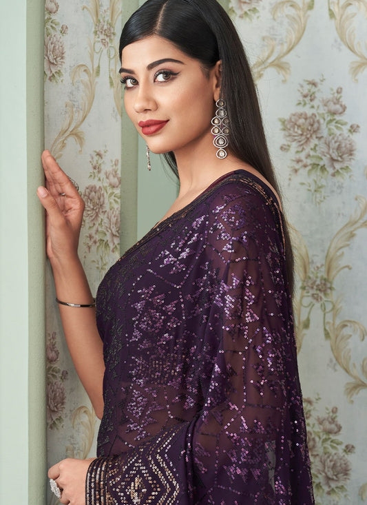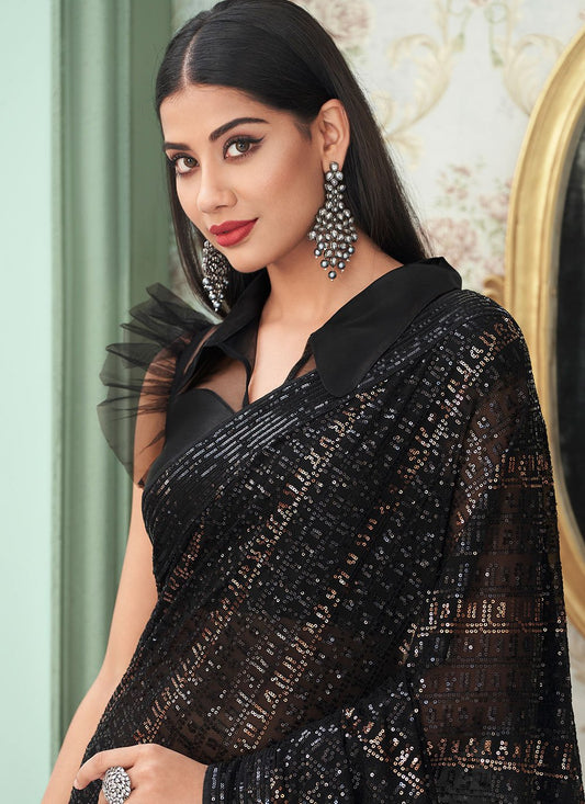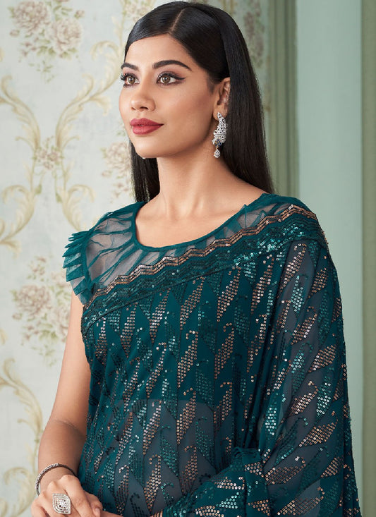 Contemporary Georgette Satin Turquoise Embroidered Saree