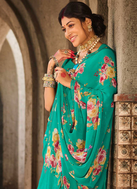 Contemporary Vichitra Silk Teal Embroidered Saree
