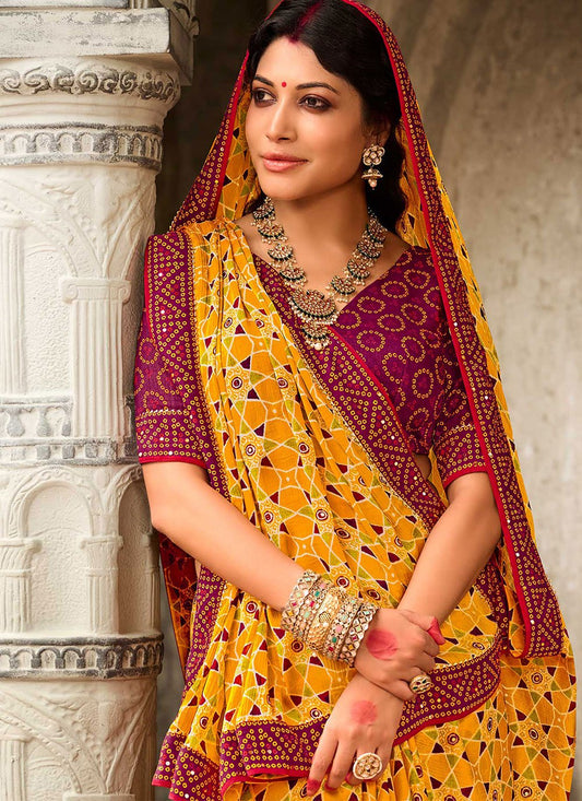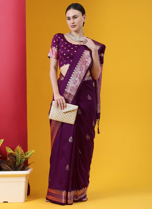 Contemporary Vichitra Silk Wine Embroidered Saree