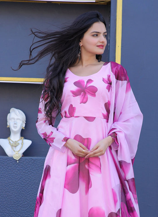 Gown Georgette Silk Hot Pink Embroidered