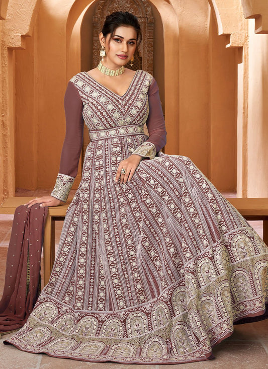 Gown Faux Georgette Mauve Embroidered Gown