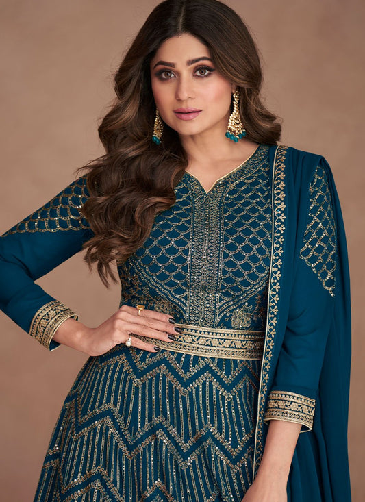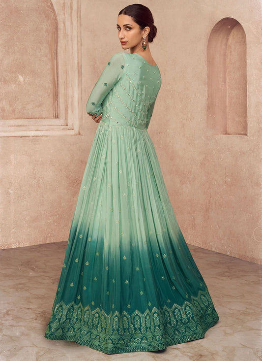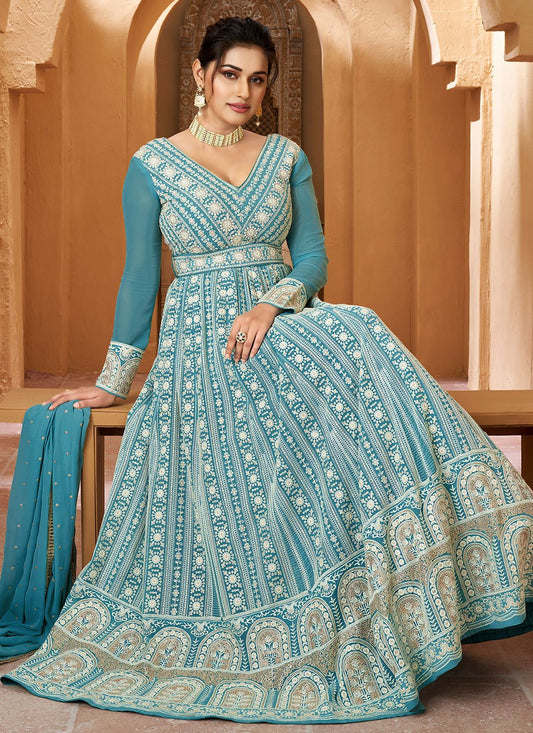 Designer Gown Georgette Aqua Blue Embroidered