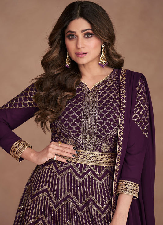 Gown Georgette Purple Embroidered Gown