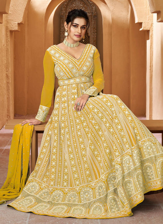 Gown Georgette Yellow Embroidered Gown