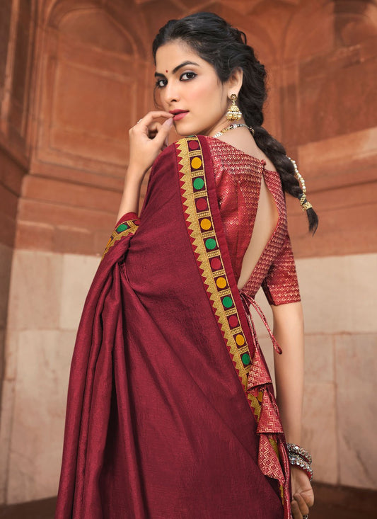 Classic Vichitra Silk Maroon Embroidered Saree