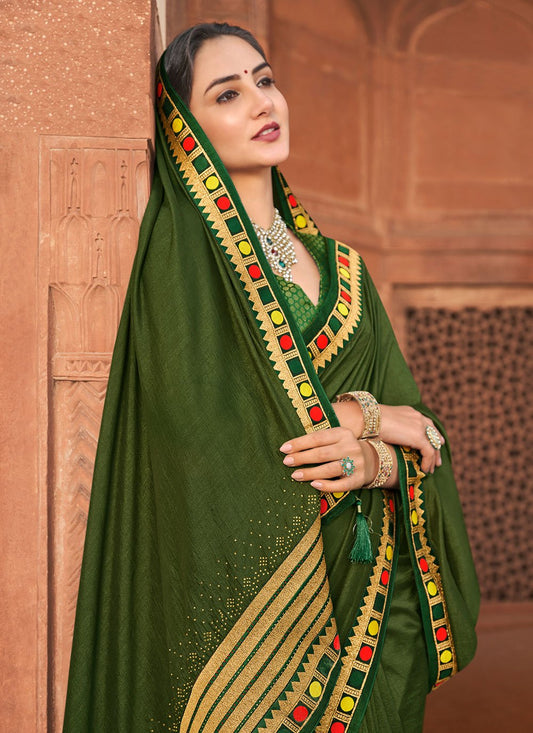 Designer Vichitra Silk Green Embroidered Saree