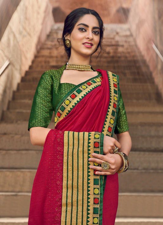 Classic Vichitra Silk Red Embroidered Saree