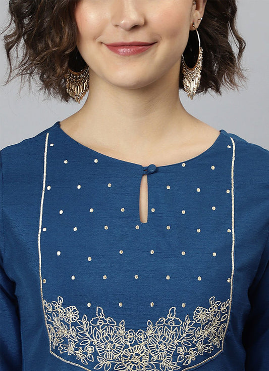 Designer Kurti Silk Blue Embroidered Kurtis