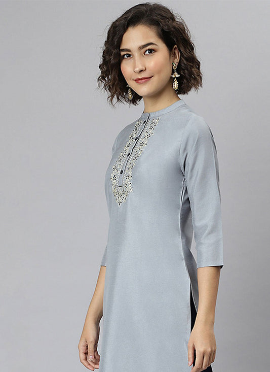 Casual Kurti Silk Grey Embroidered Kurtis