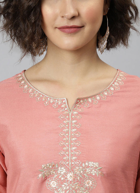 Party Wear Kurti Silk Peach Embroidered