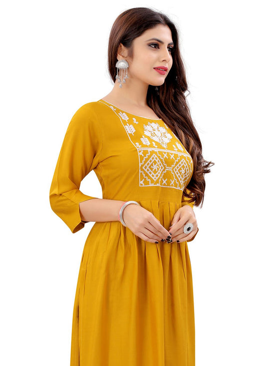 Party Wear Kurti Rayon Mustard Embroidered