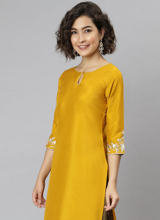 Designer Kurti Silk Yellow Embroidered Kurtis