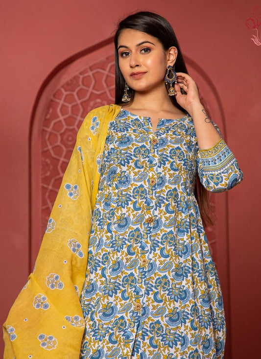 Designer Kurti Cotton Blue Yellow Fancy