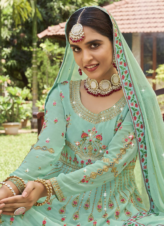 A Line Lehenga Georgette Aqua Blue