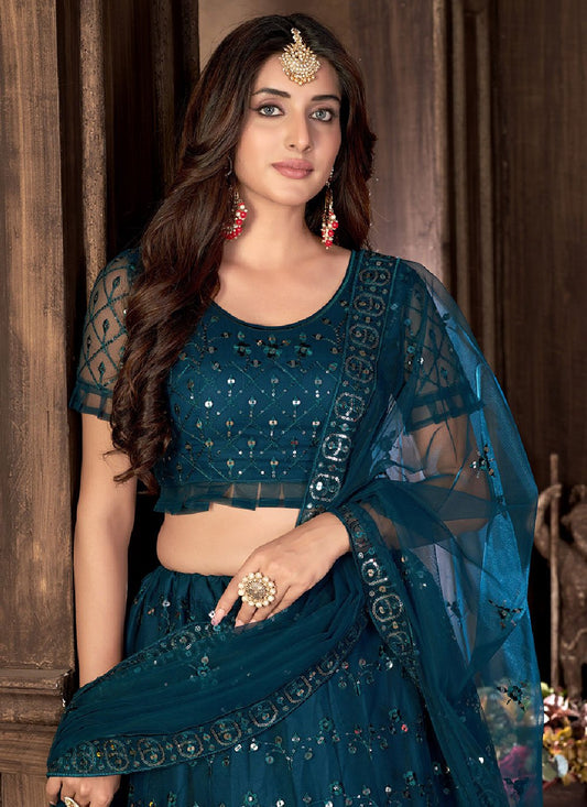 Lehenga Choli Net Aqua Blue Embroidered