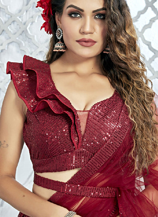Lehenga Choli Net Maroon Embroidered Lehenga