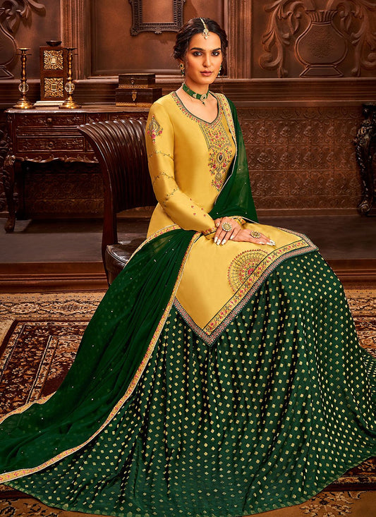 A Line Lehenga Satin Green Weaving