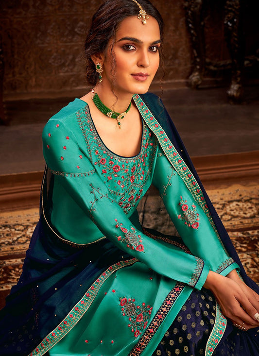 Lehenga Choli Satin Sea Green Embroidered