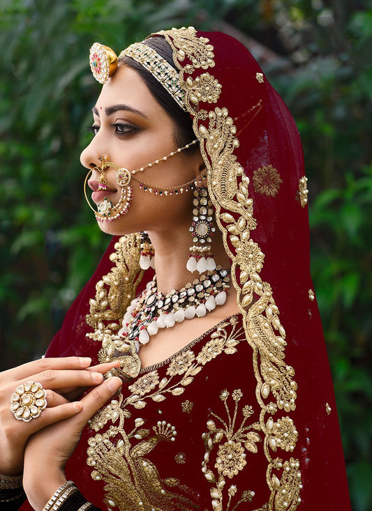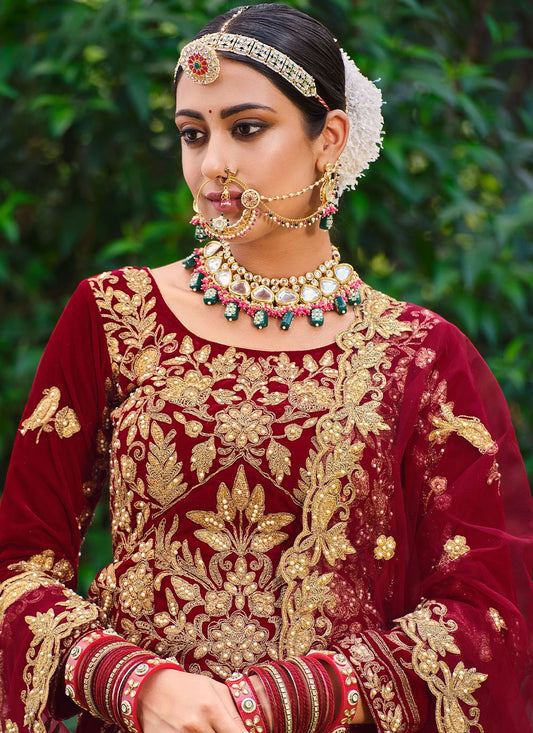 Lehenga Choli Velvet Red Embroidered Lehenga