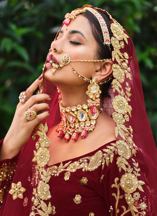 Lehenga Choli Velvet Maroon Diamond Lehenga