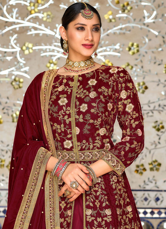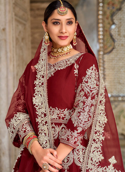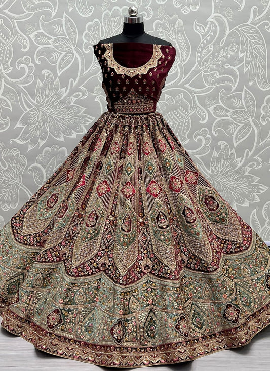 Lehenga Choli Velvet Maroon Embroidered Lehenga
