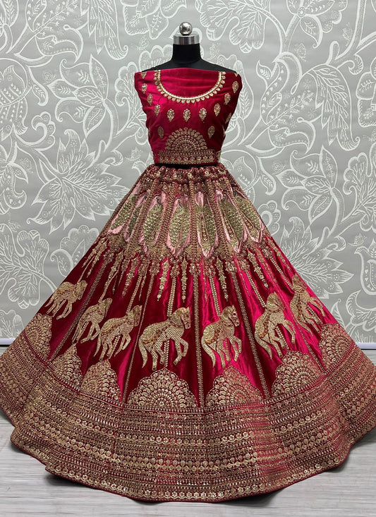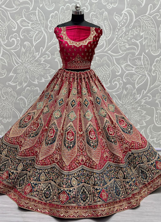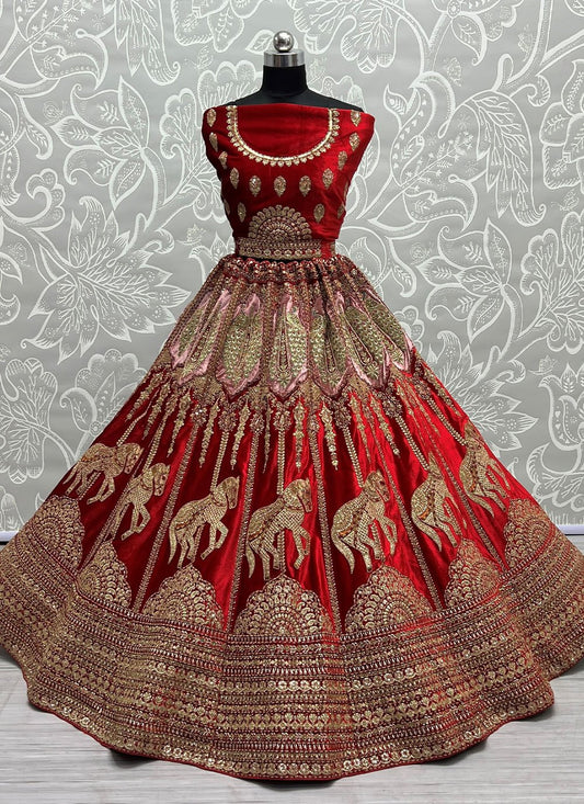 Lehenga Choli Velvet Red Embroidered Lehenga