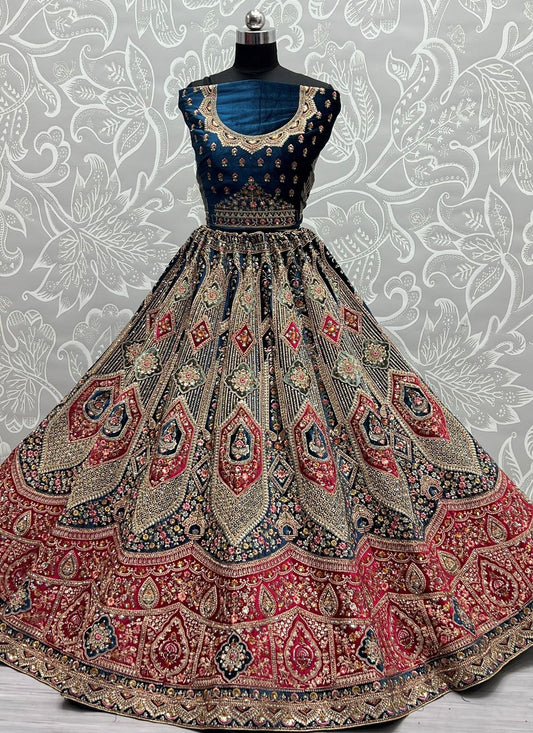 Lehenga Choli Velvet Blue Embroidered Lehenga