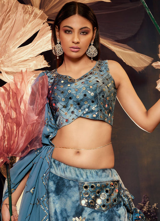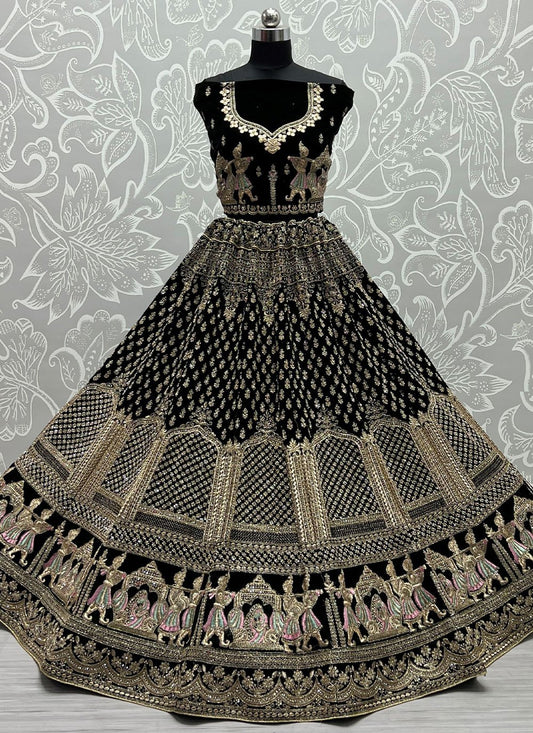 Lehenga Choli Velvet Blue Embroidered Lehenga