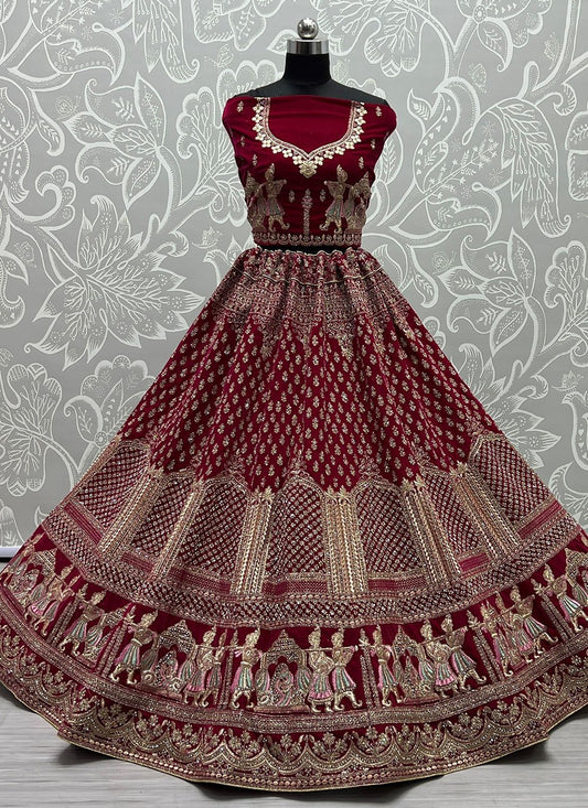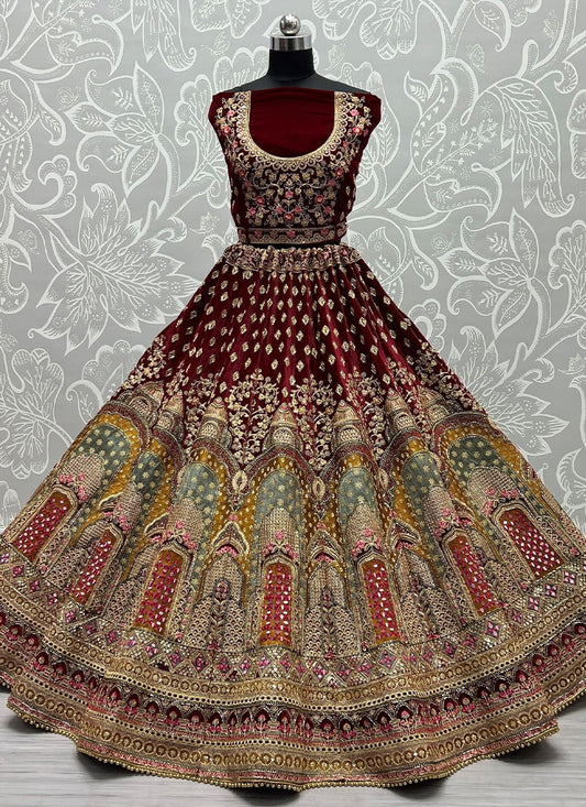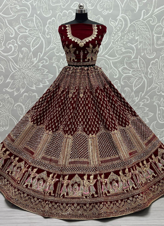 Lehenga Choli Velvet Maroon Embroidered Lehenga