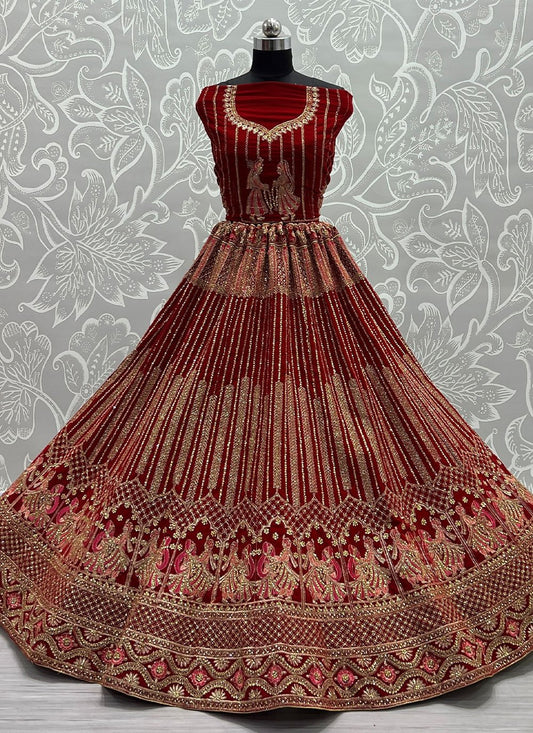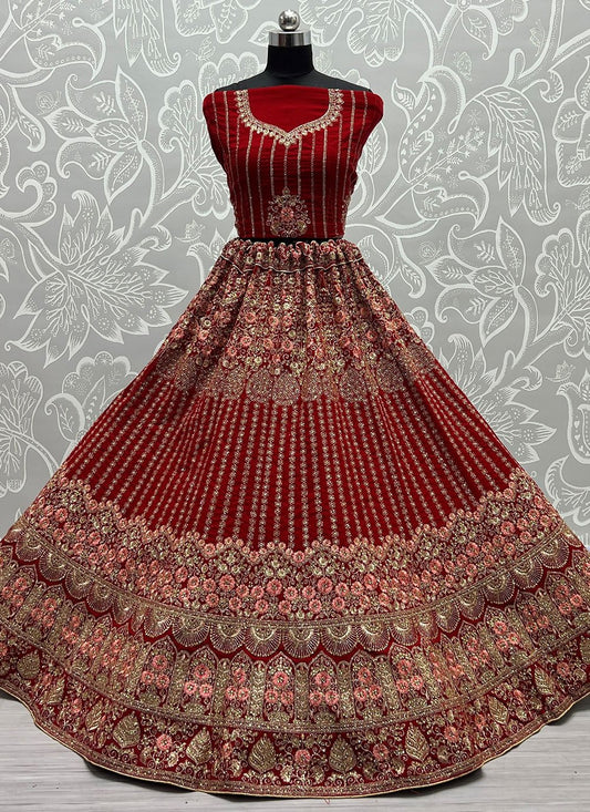 Lehenga Choli Velvet Red Embroidered Lehenga