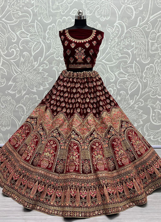 Lehenga Choli Velvet Maroon Embroidered Lehenga