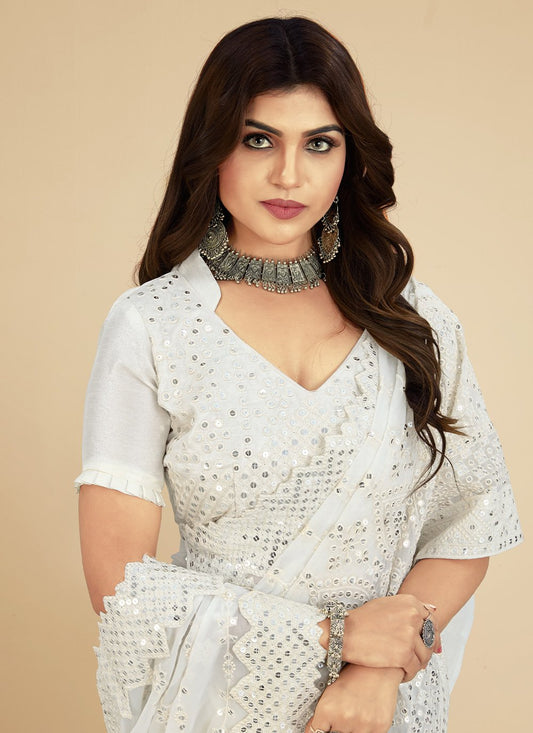 Classic Georgette White Lucknowi Work Saree