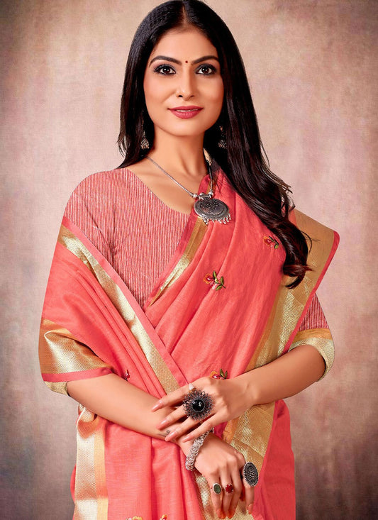 Trendy Saree Linen Silk Peach Embroidered