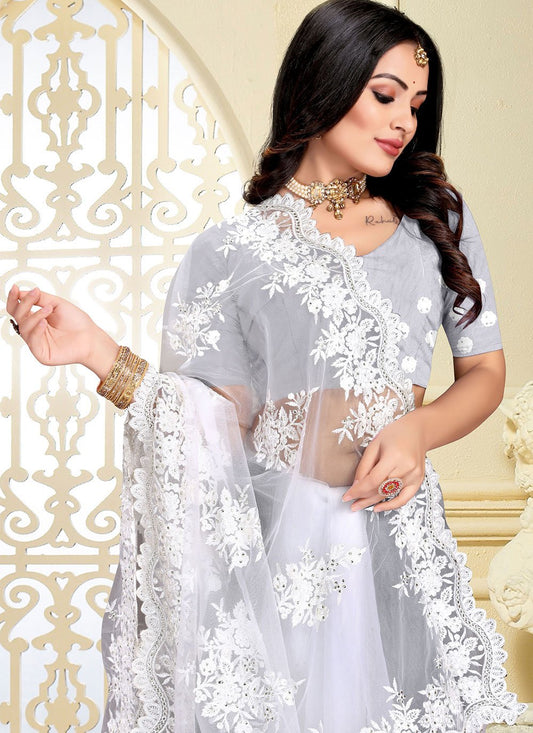 Classic Net White Embroidered Saree
