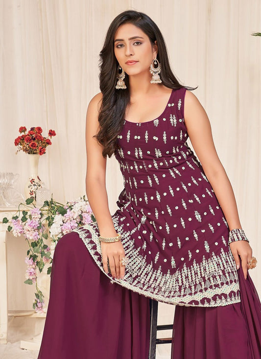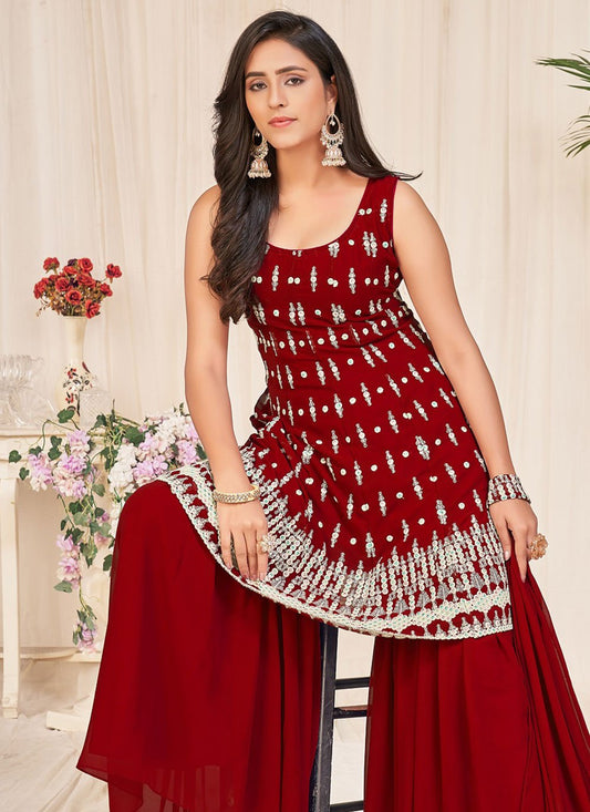 Sharara Set Georgette Maroon Embroidered Salwar