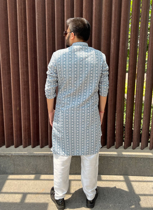 Kurta Pyjama Soft Cotton Blue Embroidered