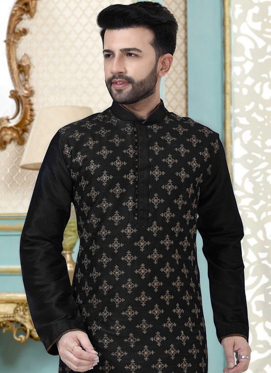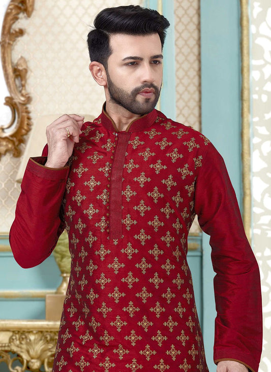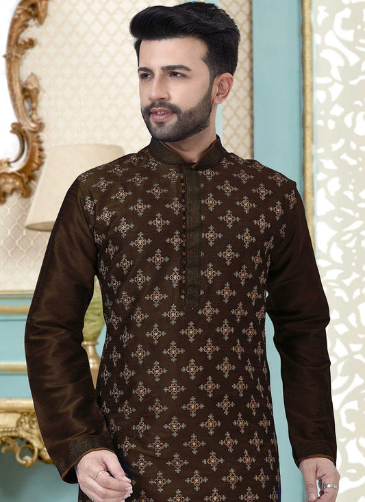 Kurta Pyjama Dupion Silk Brown Embroidered