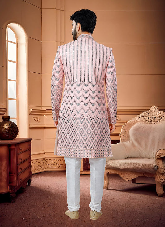 Indo Western Sherwani Silk Pink Embroidered