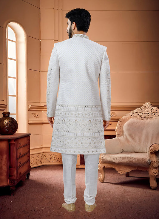 Indo Western Sherwani Silk White Embroidered
