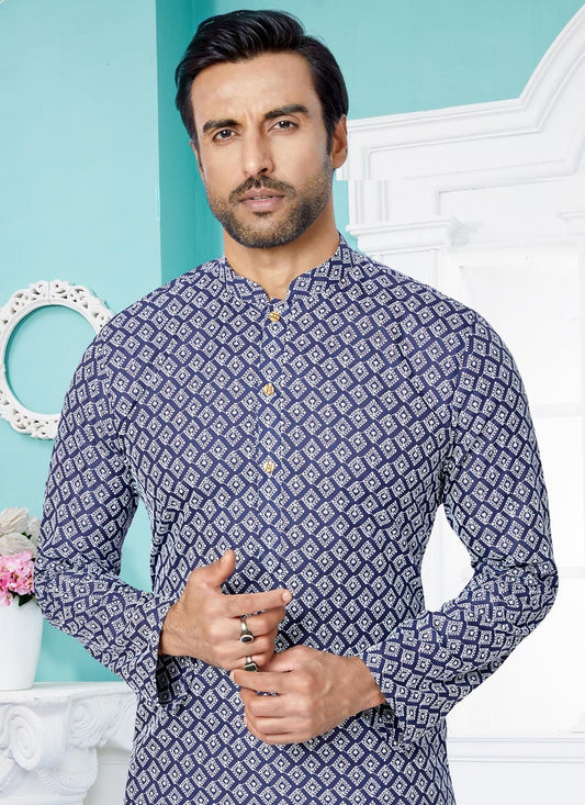 Kurta Pyjama Georgette Blue Embroidered Mens