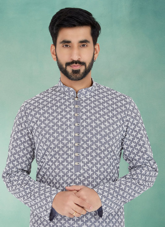 Kurta Pyjama Georgette Grey Embroidered Mens