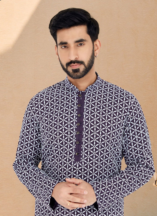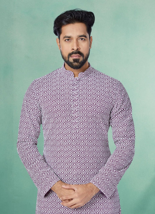Kurta Pyjama Georgette Purple Embroidered Mens