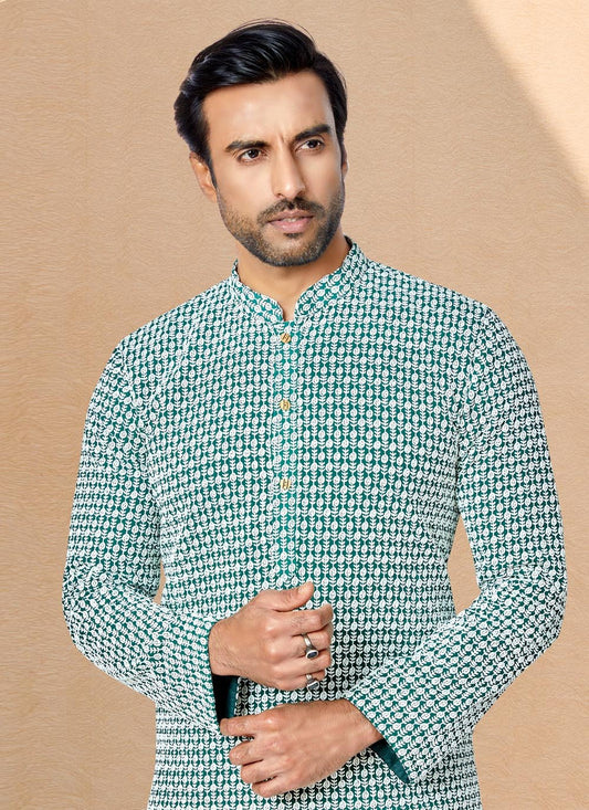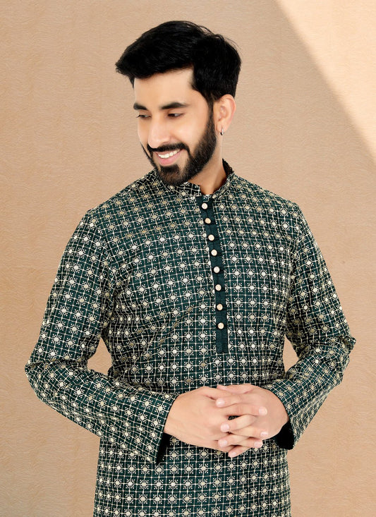 Kurta Pyjama Jacquard Silk Green Embroidered