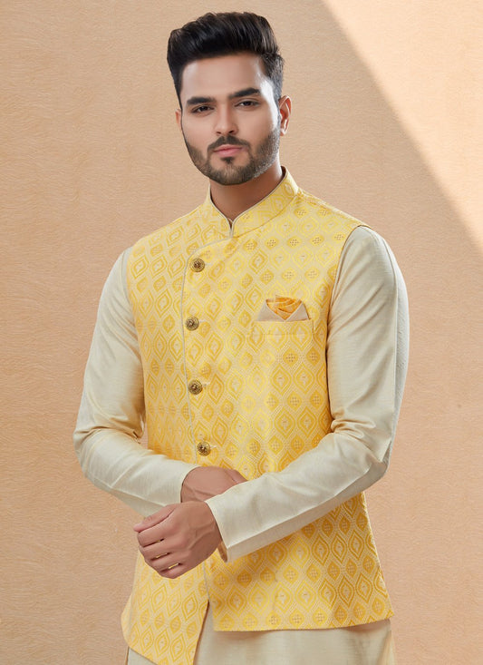 Kurta Payjama With Jacket Silk Cream