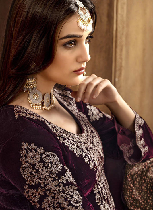Palazzo Salwar Suit Velvet Maroon Embroidered