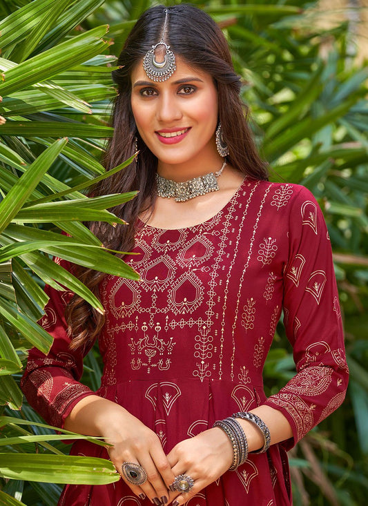 Gown Rayon Maroon Floral Patch Gown