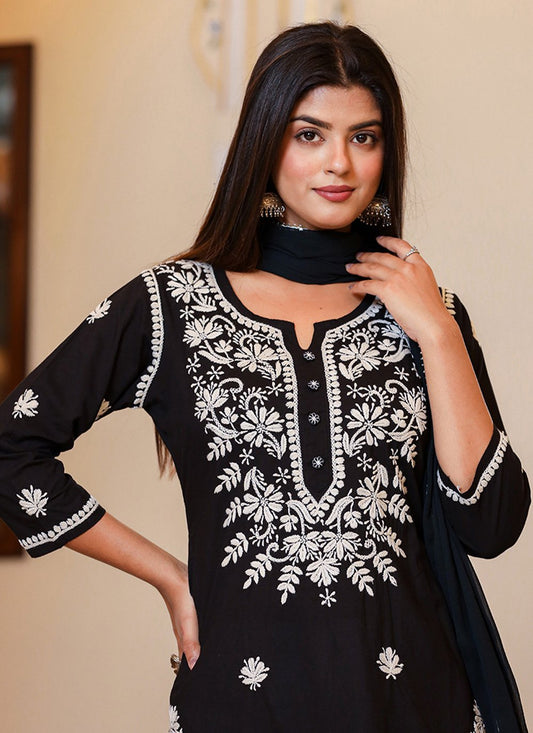 Salwar Suit Cotton Black Lucknowi Work