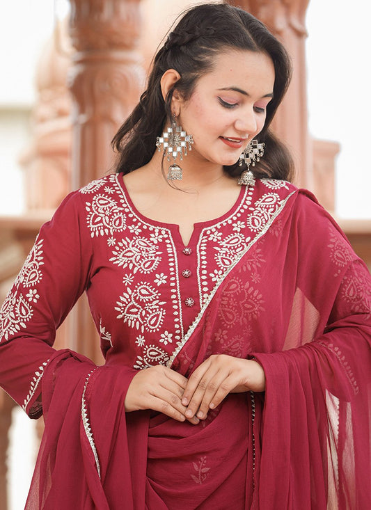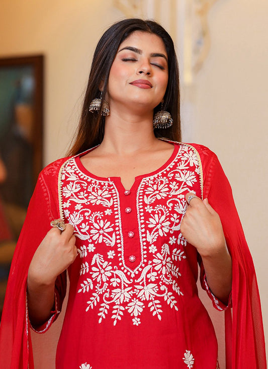 Salwar Suit Cotton Red Lucknowi Work