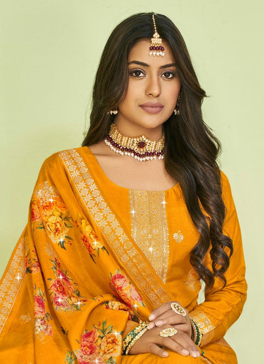 Churidar Suit Jacquard Mustard Embroidered Salwar